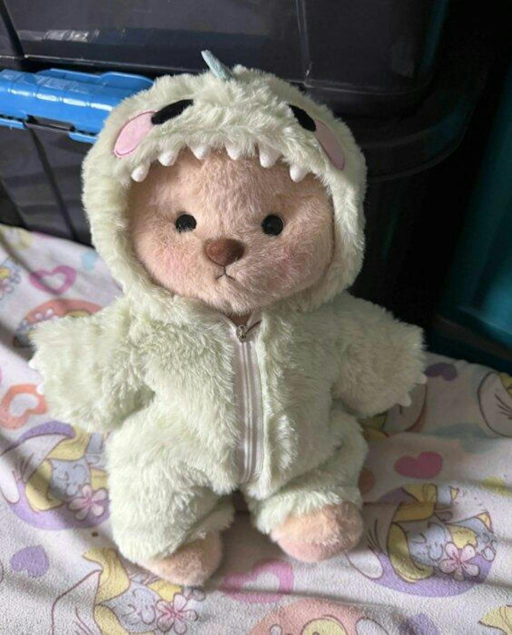 Ez az imádnivaló, pihe-puha barna plüssmaci egy vidám zöld dínó jelmezben igazi különlegesség. Garantáltan mosolyt csal kicsik és nagyok arcára, és pillanatok alatt belopja magát a szívbe.